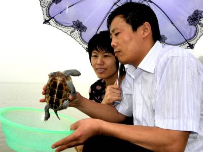 9月5日清晨,家住三峡库区秭归县城区锦绣花园小区的市民王爱民夫妇俩正在长江边放归一只背部有着金色花纹的乌龟。这只可爱的小乌龟是王先生两天前偶然在长江边捡来的,在被王先生一家人精心喂养两天后得以重回长江、回归大自然。本报视界网王爱平摄