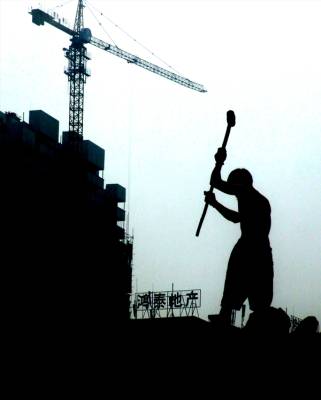 黄石东风路旧城区正在开发改造,一工人正抡起大锤埋头苦干。
