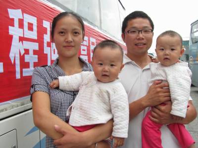 9月5日上午,湖北郧县镇杨溪铺镇杨溪铺村村民龚剑、蔡维夫妇正抱着仅有七个月的双胞小女儿在宜城市安置地合影留念。杨溪铺镇为南水北调中线工程核心水源区,当天村民龚剑一家随杨溪铺村5个组147户657人外迁宜城市邓林农场,他们将在新的环境,开辟新的生活。