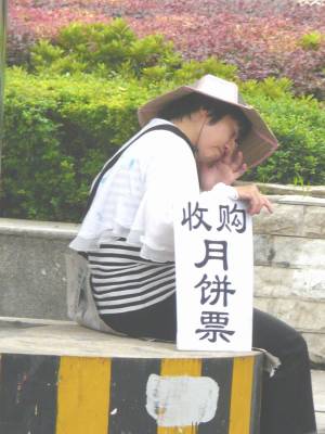 尽管离2010年中秋佳节还有半个多月的时间,湖北武汉商家酒店饭店的月饼大战己经静俏俏的打响。9月5日下午,在汉口青年路航空路口,随时可见收售月饼票的"黃牛",穿梭或停留在过往的行人中,进行月饼票的"交易"。