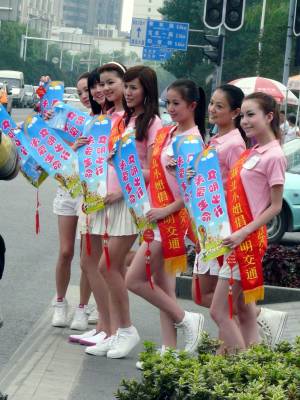 9月6日下午,7名身披印有黃色字的"湖北小姐倡导文明交通"红色缎带的风华正茂的靓丽女青年,来到了汉口建设大道与新华路交汇的十字路口,手持关爱生命文明出行的宣传画,与武汉市公安交管局江汉大队的交警一起,文明执勤,倡导过往车辆和行人珍爱生命,文明过马路。