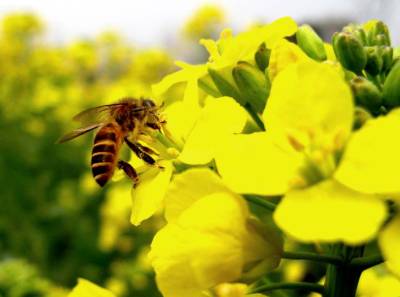一只蜜蜂在油菜花上采粉,却浑然不知人的到来,真是”爱岗敬业”的模范!