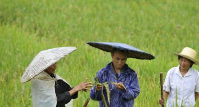 9月6日,竹溪县中峰镇朝阳村农民在贡米基地挑选双穗稻。2009年9月获得国家地理标志产品保护认证的”竹溪贡米”,严格实行统一测土配方施用农家有机肥、统一使用生物型病虫害防治技术的无公害种植方式,全县今年10万亩有机贡米生长良好,丰收在望。(本报记者熊海泉视界网签约摄影师周明鑫)