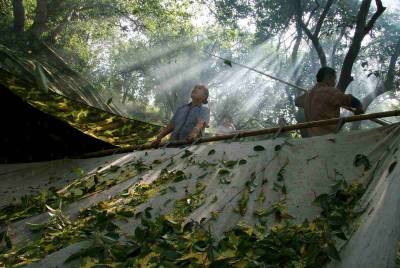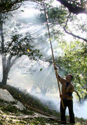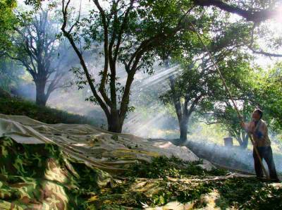 咸宁桂花镇每年金秋时节桂花飘香,村民们纷纷以家庭为单位,在自家的责任地里,拉扯大布单,手持长竹竿,打起飘香四溢的桂花,出售给收购商。