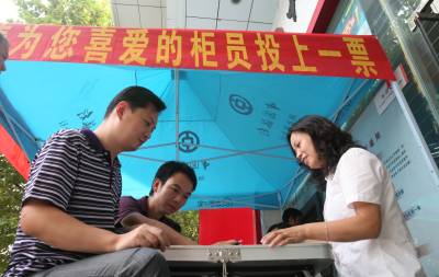 9月7日,中国银行仙桃商城支行负责人许莉向客户介绍柜员基本资料,请客户为喜爱的柜员投上一票。中国银行仙桃支行全力打造服务市民品牌银行,通过不断听取客户之声、员工之声,不断改进、完善服务体系,使全行服务水准跃上一个新台阶。吴三红摄