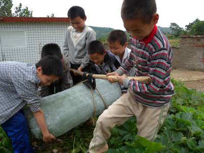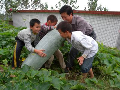 9月7日,湖北省郧县谭山镇高杨寄宿制小学的蔬菜基地里,师生一起摘掉了他们的宝贝疙——”冬瓜王”,这个冬瓜长112厘米,直径33厘米,重134.2斤,在当地农村实属罕见。自2008年起,郧县各寄宿制学校有了自己的蔬菜基地,基地不仅是学校学习实践的乐园,也让学生们每周吃上自己种的新鲜蔬菜,体验到劳动的艰辛与快乐,品尝到收获的喜悦。