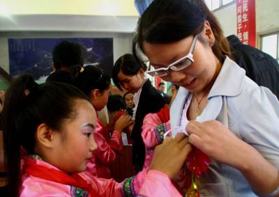 我给支教老师戴红花(通讯员陈家胜田祚盛)9月8日,建始县官店镇的少先队员正在给资教生曹晓霞等佩戴红花。在全国第26个教师节即将到来之际,官店镇表彰了一批优秀教师和学校,五位资教生得到嘉奖,代表全镇26名资教同事分享了荣誉。官店为建始县高寒乡镇,山大人稀,自然条件比较恶劣,这些年优秀教师流失严重,资教生的到来,一定程度缓解了这里师资短缺的矛盾。为鼓励资教生在这里安心工作,该镇出台了一系列政策,帮助资教生”留心,留人”。通讯地址:建始县新闻中心(445300)13635773719