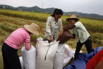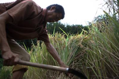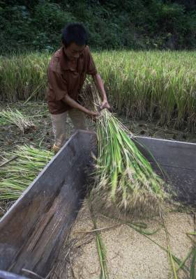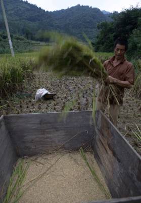 宜昌远安县中稻喜获丰收2010年9月8日,一农民采用传统的方式用板仓打谷。湖北省远安县利用得天独厚的原生态自然环境,大力发展种植远安大米,远安大米曾在乾隆年间列为”贡米”。通过调整农业结构、落实国家的惠农政策,极大的调动了农民的种粮积极性,今年全县中稻面积达到12万多亩,比往年增长2成以上。文振效