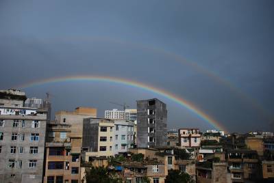 利川城现”双彩虹”奇观9月8日下午16时45分左右,利川城区上空出现两道美丽的彩虹,这是继7月26日利川出现”双彩虹”后再现如此景观。当时,刚刚下了一场细雨,天空还乌云团聚,彩虹突然出现,煞是美丽壮观。彩虹持续约15分钟后,才慢慢消失。(视界网秦卫飞)相关链接:据该市气象台技术人员介绍,”双彩虹”这奇妙的自然景象不多见,但其产生原理与通常的单道彩虹相同。彩虹的形成是由于空气中的小水滴把阳光经过折射形成的。当光经一次折射和一次反射后形成的是一个正彩虹(主虹)。有时,光会形成两次折射和一次反射后也会形成彩虹,不过这个彩虹是反的,即”副虹”(又称霓)。霓的颜色排列次序跟主虹是相反的。由于每次反射均会损失一些光能量,因此霓的光亮度亦较弱。副虹一定跟随主虹存在,只是因为它的光线强度较低,所以有时不被肉眼察觉。