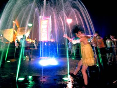 广场的喷泉给炎热的夏夜带来一丝凉意,小朋友们在喷泉中穿越嬉戏,既开心又凉爽。