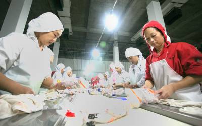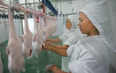 9月10日,仙桃市三伏潭镇德丰公司对农民养殖的一批樱桃谷鸭进行屠宰。德丰公司是该镇引进的一家集孵化、繁殖、屠宰于一体的农业产业化龙头企业,总投资1.2亿元人民币兴建,可年加工水禽2000万只。该公司采用”公司+基地+农户”的模式实行产业化经营,组织周边农民养殖樱桃谷鸭这一新品种,由公司提供饲料、防疫药品和技术,实行产业化一条龙生产和服务,今年上半年,农民养殖樱桃谷鸭400多万只,取得了较好的经济效益。吴三红摄