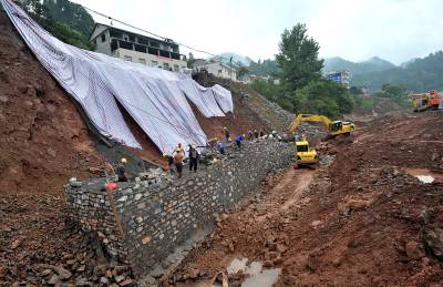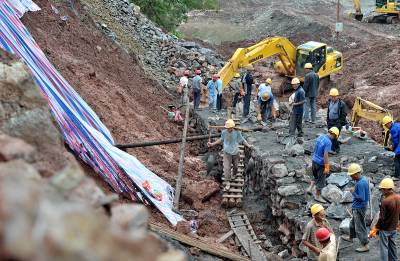 9月11日,因地质滑坡中断的209国道宣恩县境内抢险施工现场,工人正在紧张施工。9月5日下午4时许,209国道2000km+200m-2001km+600米处因地质滑坡致交通中断,该县交通部门随即组织抢险。据介绍,预计9月16日午后该路段可实现单边通行,而全线恢复通车尚需一段时间。由于及时实行交通管制、制定绕行方案并派出大量交警上路引导、疏通过境车辆,209国道中断没有造成交通拥堵。本报视界网宋文摄