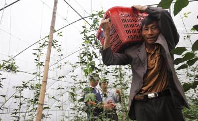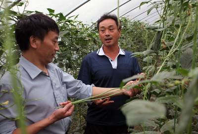 9月12日,被称为”泥腿老总”的蔬菜老板寇青海在其蔬菜大棚向镇政府干部介绍蔬菜销售情况。1994年,寇青海从陕西平利县来到湖北竹溪县,租赁当地农场20亩耕地种植大棚反季蔬菜,并逐年扩大规模。去年,他投资10余万元,在城关镇水寨村、长旺村等地发展蔬菜120亩,今年可实现纯收入10万余元。近3年来,城关镇通过争取项目以奖代补,引进大户规模种植,股份合作向外扩展的办法,使全镇蔬菜基地稳定在1500亩左右,丰富了全县居民的”菜篮子”。(本报记者熊海泉、视界网签约摄影师周明鑫)