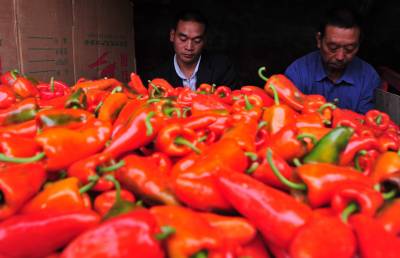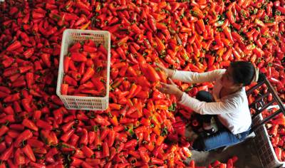 9月15日,在湖北省恩施市沙地乡神堂村,村民在辣椒堆中劳作。近几年来,恩施市沙地乡引导农民种植辣椒,并成立了专业合作社,成为远近闻名的辣椒种植和交易基地,吸引了来自全国各地的菜商前来收购,一派红火景象。视界网杨顺丕通讯员向玲摄