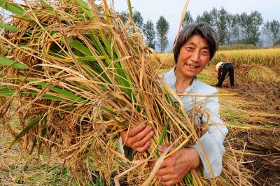 9月16日,保康县马良镇马良街村农民王淑枝在收割水稻。金秋九月,稻浪阵阵,稻菽飘香。保康县5万亩水稻获得大面积丰收,喜获丰收的农民笑逐颜开。(本报视界网杨韬摄)