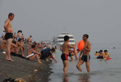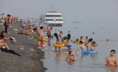 9月18日晚,数千市民在汉江襄樊段鱼梁洲附近的江堤上和浅水区戏水降温。最近一个星期,湖北省襄樊市持续出现35℃的高温闷热天气。连日来,在汉江襄樊段鱼梁洲附近几公里的浅水区,每到傍晚就会有数千市民前来天然浴场戏水,享受清凉,躲避秋老虎。