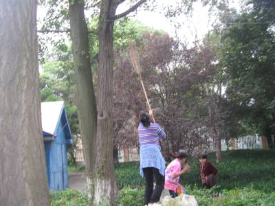 前天,荆州市中山公园里,多棵银杏树上的果实成熟,引来晨练的老人捡拾,还有一些大嫂在采摘。