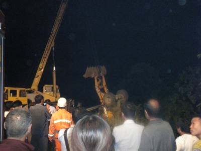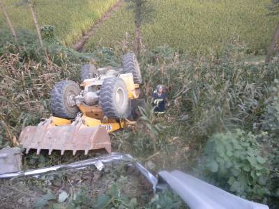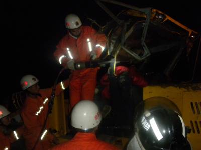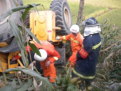 9月18日下午17时40分许,郧县消防大队接到县公安局110指挥中心调度:杨溪铺镇刺架岭公路一铲车翻下深沟,有两人被卡在车中,生死不明,请立即前住处置。接警后,郧县大队立即出动一台抢险救援车和9名消防官兵火速赶往现场。由于事故现场距县城30多公里,消防救援官兵一路急驰,于18时13分赶到现场。此时现场已站满了围观群众,交警、派出所民警对现场进行封锁,在路旁约5米高的路基下,一辆大铲车四脚朝天躺在路基下,由于铲车在翻滚撞击,驾驶室严重变形,两名男子被卡在驾驶室里,不能动弹,而铲车油箱里的柴油在不断流淌。为尽快救出被困人员,郧县中队指挥员郑飞立即带领官兵用沙土覆盖铲车油箱流淌出的柴油,以防引发火灾。消防官兵在施救过程中发现,由于驾驶室变形严重,加上铲车所在位置处于斜坡上,消防官兵根本无法用破拆器材进行施救,再者天色渐渐黑了下来,一旦铲车再次发生翻滚,将会危及救援人员的生命安全。为不影响救援,消防官兵立即与现场交警协调,请求联系吊车将铲车吊上路面,再进行实施营救。19时许,从郧县县城联系的吊车到达现场,立即开始吊车,由于事故现场正上方有一高压线,影响救援进行。为此,派出所民警联系供电部门断电;交警将事故现场的公路进行临时交通管制;消防官兵疏散围观群众,同时打开抢险救援车的照明设施对现场作业进行照明;吊车工作人员将吊绳牢牢得捆在铲车上,一切准备妥当,吊车开始起吊。20时30分,铲车被成功吊上路面。20时32分,等铲车放稳后,消防官兵开始用液压剪进行破拆,20分钟后,被困在驾驶室内的两名被困者终于被抬出来了,经现场医护人员检查,两人在铲车翻下路基时由驾驶室严重变形挤压,早已死亡。事故发生后,郧县交警部门已对事故原因进行调查。