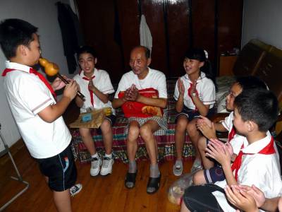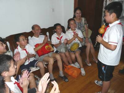 在2010年中秋和国庆佳节来临之际,江汉区唐家墩街青教办香江社区与北湖小学联合开展了关爱社区空巢老党员的活动。9月19日下午,该校六年级(5)班同学们放学后,冒着"秋老虎"的35℃以上高温,走进了交通宿舍78岁的共产党员朱良大的家,为这位脑出血中风行动不便的离厂退休老爷爷,送上了月饼、哈密瓜、葡萄等过佳节慰问品,送上了同学们为他特制的佳节祝福卡,送上了一曲优雅动听的葫芦丝,使这位老党员感动万分,多次说出了"感谢党和政府!感谢街社区!感谢师生们!"的心里话。