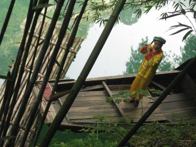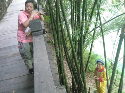金笛引”凤”三峡人家风景区以幽幽绕耳的笛声吸引游客,高级女摄影师朱立凤激情吹奏一曲。