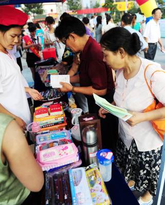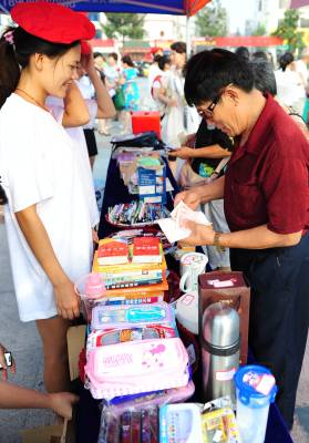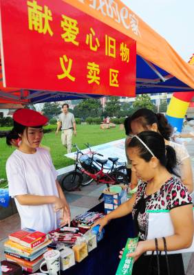 21日,湖北省潜江市民在广场购买市民捐献的旧物,旧物义卖的资金将全部捐赠给贫困学生。当日,该市妇联等部门启动”低碳家庭、时尚生活”现场推进会。积极倡导广大家庭实行低能量、低消耗、低开支、低代价的低碳生活方式,以通过家庭来影响社区,通过社区来推动全社会节能减排工作的良性发展。本报视界网吴燕军通讯员刘高丽