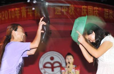 20日晚,在襄樊一中举办的青年教师”迎中秋,庆国庆”联欢会上,两名女教师在进行众多自创游戏中的一项比赛,这是襄樊一中多年来坚持的一项传统,让平时严肃认真的青年教师在协作游戏中放松心情,减轻工作压力。