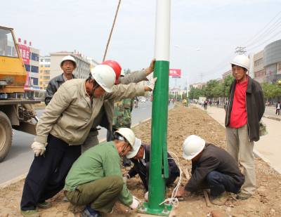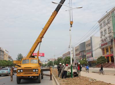 随着107国道孝昌城区主干道和人行道路段的完工,为确保国庆节前街道两侧的路灯能亮起来,营造欢乐祥和的节日气氛,孝昌电力部门职工节假日不休息,在保证质量的基础上抢进度安装新路灯。图为9月23日上午11点50分许,施工人员放弃中秋节休假,加班安装107国道两侧的新路灯。宋俊初摄