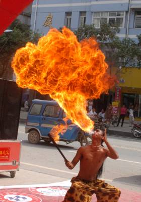 9月23日,四川全友家私落户保康县。图为新街门面店开业之即,缅甸小伙现场表演喷火。