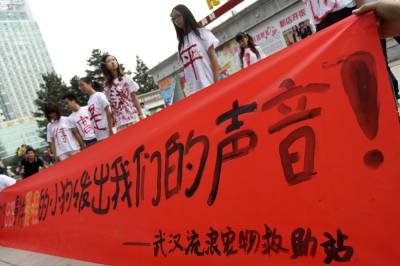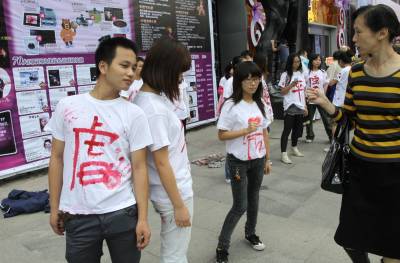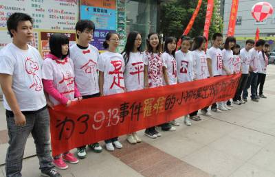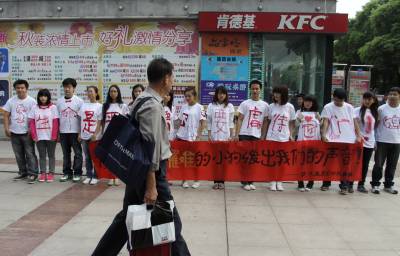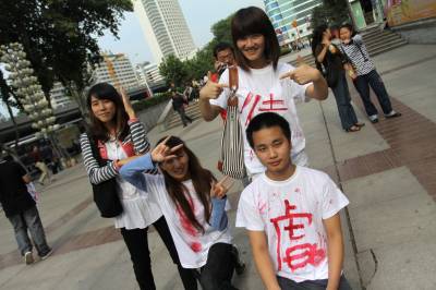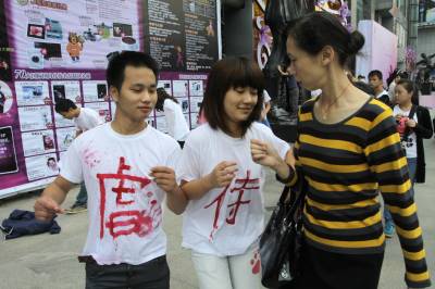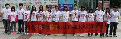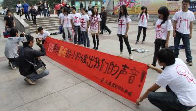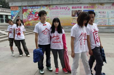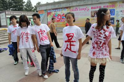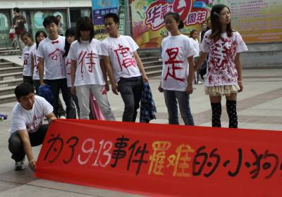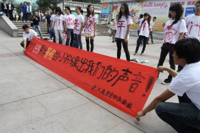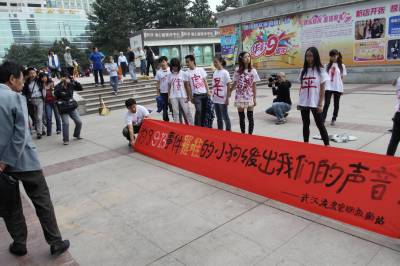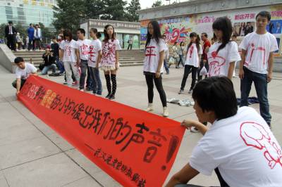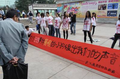 2010年9月23日,湖北武汉,25名高校学生在汉口街头突然脱掉外衣,露出写在身上的标语”动物生命是平等请不要虐待动物!”两名男生打出横幅”为了9.13事件罹难的小狗发出我们的声音!”据了解,9.13事件是指9月13日《楚天都市报》报道的刚出生的3只小狗头部被射入排钉的严重虐待动物事件。