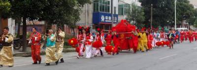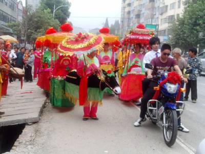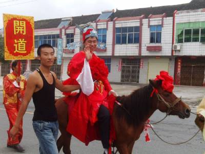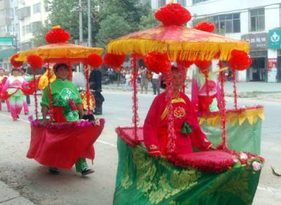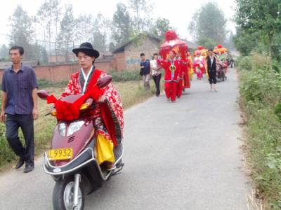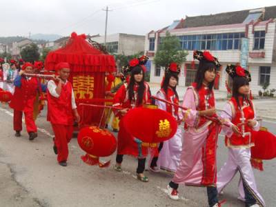 民俗助兴花轿迎娶怀旧婚礼俏车城荆楚网丹江口24日讯(通讯员许光泽)9月23日(农历八月十六),中秋假日第二天上午。一支大锣开道、大鼓压阵,骑着高头大马的新郎带领着一群敲打着腰鼓边走边舞的秧歌队和数十名身着盛装、高举彩旗和大红喜字匾牌,手持红灯笼的俊男俏女呼拥着一顶八抬大红花轿组成的迎亲队伍成为丹江口市丁家营镇众人瞩目的焦点。据笔者所知,这是当地一周来第三支怀旧、复古婚礼场面。9月16日和9月21日,丁家营镇先后出现由彩车旱船,秧歌锣鼓簇拥着大红花轿的迎新队伍.所不同的是前两起是四人抬的花轿,新郎或乘坐他人摩托,或自己驾驶摩托车。据了解,这种怀旧婚礼倍受张扬个性,追求”时尚”,刻意让自己的婚礼出新出彩青年人的推崇和追捧。图1:骑在马上的新郎图2:摩托车载着新郎图3:亲自驾车的新郎图4:前呼后拥的八抬大轿图5:浩荡迎亲队伍图6:花轿前新娘娇羞一笑图7:四人抬花轿图8:彩车助兴丹江口市丁家营镇中心学校