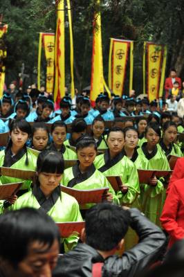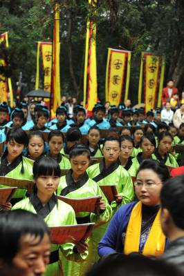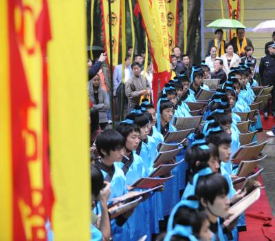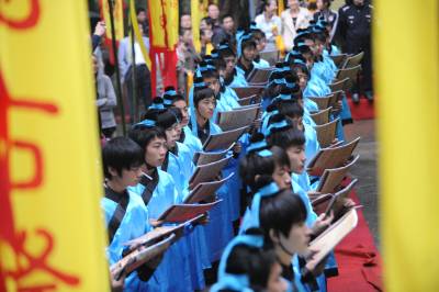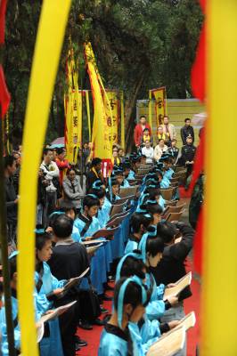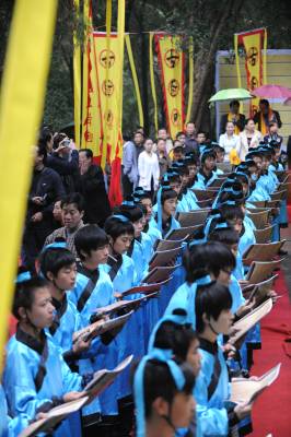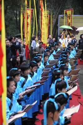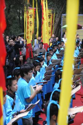 9月25日上午,湖北襄樊百万学子齐诵《诫子书》,该活动采取异地同时诵读方式。主会场在古隆中风景区三顾堂前,分会场遍布襄樊市区、县(市)区知名历史文化景点,以及各大、中、小学校校园。主会场齐诵、合唱学生由襄樊四中、襄樊四中义教部、襄城实验小学各派100名学生组成。 诵读活动现场总导演、市豫剧团团长雷剑朝介绍,作为主会场,古隆中三顾堂门前正中位置摆放组委会特别定制的高1.8米的诸葛亮铜像,两边将摆放书写着《诫子书》的大型竹简背景;舞台两边将竖立两个宽1.8米、高5.8米的大幡旗,上书襄樊电大教授陈新剑所作对联”一片寻根情后裔聚首朝诸葛满腔弘德志学子放声诵妙文”;从隆中风景区到三顾堂的道路上,将竖起88面上书”古隆中赤子情”的幡旗,88名装扮成三国时期武士的护旗手站立旗旁;33名鼓手将聚集在古隆中牌坊处,敲响孔明鼓喜迎八方客;现场齐诵、合唱的300名学生中的100名小学生身着三国时期的学子古装。