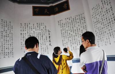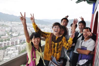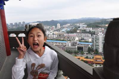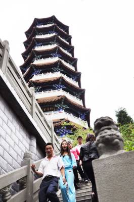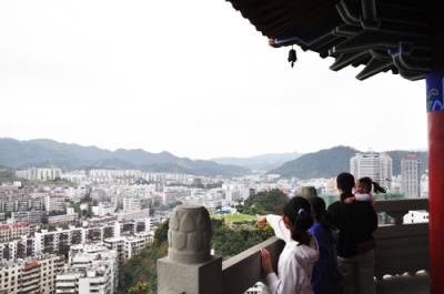 25日,来自陕西省西安理工大学的几名学生在登上十堰市重阳塔后欣喜神色溢于言表。该塔是十堰市标志性建筑景观,位于十堰市中心梅花山顶,于去年9月落成,塔高72米,共九层,每层有九个飞檐,塔内铺设399级台阶。外观以唐式风格为骨架,附以明清彩绘,显得大气庄重;内壁以诗词歌赋为主要元素弘扬孝道文化,雕梁画栋,精美绝纶,使游客在获得丰富艺术感观的同时,领略中华传统文化精髓。登上重阳塔项,十堰城区美景尽收眼底。一年来,来自全国各地40多万名游客在登塔赏景中接受孝道文化熏陶。竹山县国土资源局石濡华摄