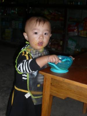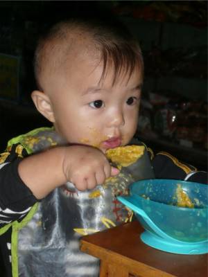 女儿刚满一岁的宝宝妮妮今年在外婆家玩,胃口特别好。没天开饭时间,一直要自己挖着吃,从不让妈妈和其他人喂,被大家誉为自强的乖宝宝!