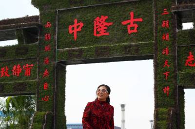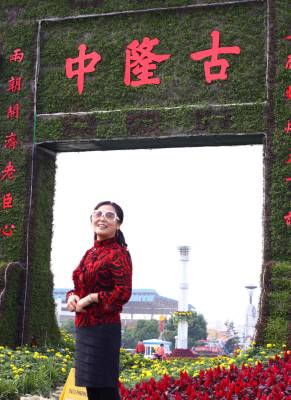 2010年9月26日,湖北襄樊,一名市民在鲜花版”古隆中牌坊”前照相留影。国庆节前夕,一座以国家4A级风景名胜区古隆中牌坊为原型,按照1:1的比例制作,由2万盆鲜花组成的鲜花版”古隆中牌坊”在襄樊诸葛亮广场亮相,为正在举办的襄樊诸葛亮文化旅游节增添了喜庆气氛。