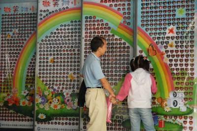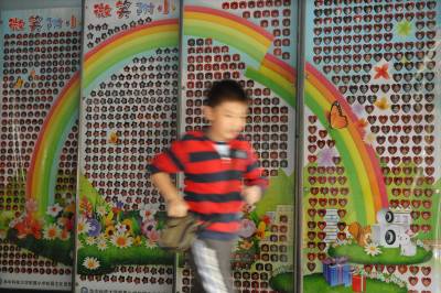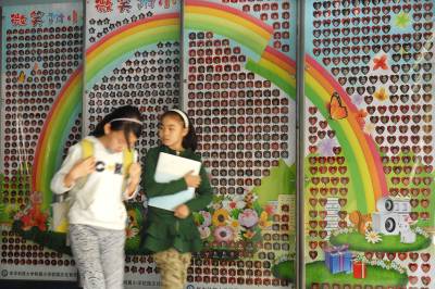 9月25日,华中科技大学附属小学,同学们经过微笑墙。国庆前夕,该校拍摄了全校千余名同学的笑脸,用彩虹桥组成了一幅幅动人的微笑图,喜迎国庆节的到来。