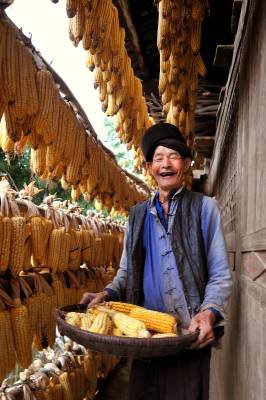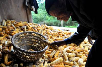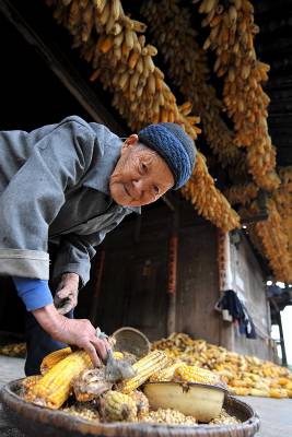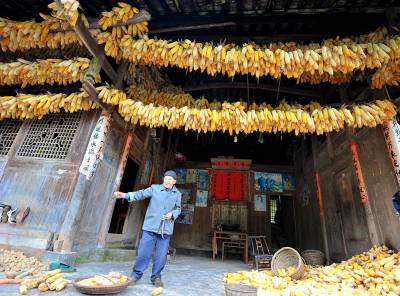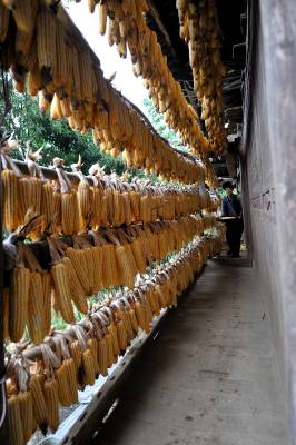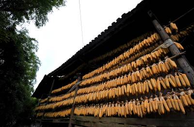 9月27日拍摄于宣恩县晓关侗族乡小高罗村。金秋时节,农民用玉米在跺脚楼上,构筑了一条土苗山寨丰收风景线。宋文摄