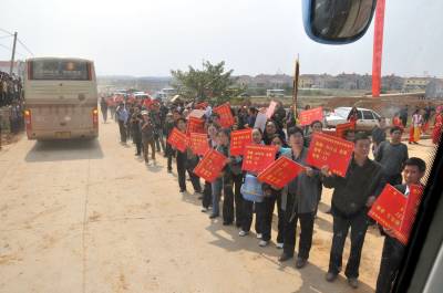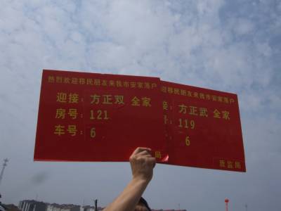 9月30日中午12:58分,湖北省宜城市移民包保工作队员在邓林农场二分场四中队移民新村迎来郧县3个村167户715人的移民入住新家,所有工作队员举着移民姓名的牌子按车号接车并将移民带进新家帮助卸车同吃一顿饭,实行长期包保。图1为等候多时的工作队员列队举牌迎接移民车队到来时的情景。图2为质监局一工作队员举着2个牌子迎接郧县来的方正双和方正斌全家时的情景。图3为教体局工作队员接到了郧县移民刘正田一家时的情景。周家山杨文华摄湖北省城建监察大队电话13872840078邮编442500