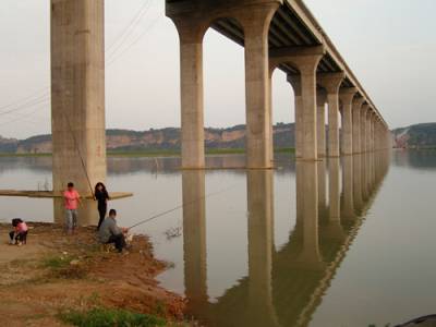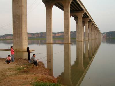 2010年中秋节下午,在即将竣工的湖北省郧县汉江第二大桥下垂钓。