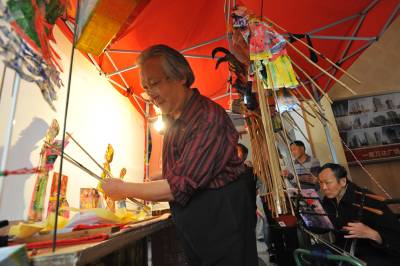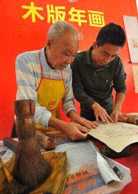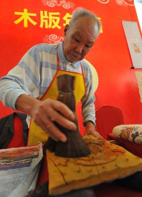 10月3日,襄樊市民在一家大型楼市销售大厅观赏传统艺术。国庆节长假期间,襄樊市一家大型房地产企业邀请来葫芦烙画、木版年画、面塑、皮影戏等传统民间艺人,让这些传统艺术和手艺汇聚一堂,每天吸引来众多青少年和家长的围观,一个个精彩国粹展示,让人们感受到了传统经典的魅力。