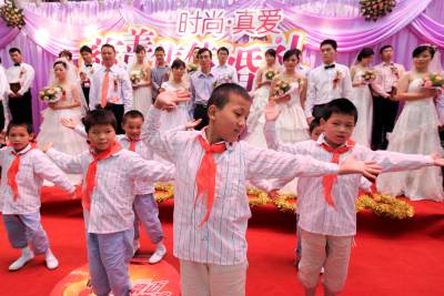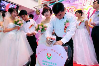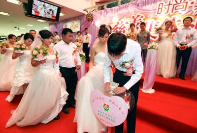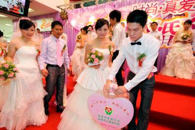 10月3日,在襄樊市一慈善集体婚礼上,18对新人为该市儿童福利院捐款近1万元。