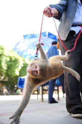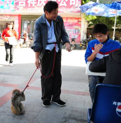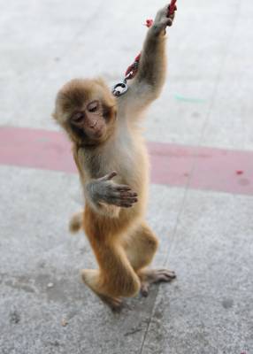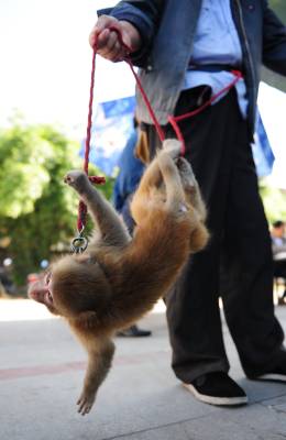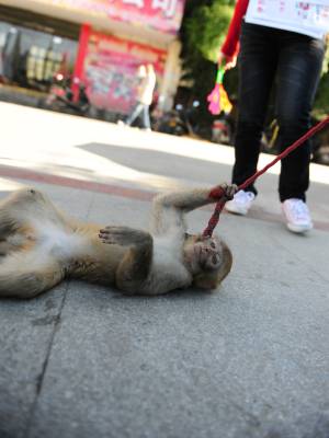 黄金周累坏小猴3日,一位河南卖艺人在湖北省潜江市街头牵着一只小猴卖艺,小猴一会儿敬礼、一会儿翻筋斗、一会儿”海底捞月”。黄金周期间,人流量多,卖艺人也乘机多挣点钱,可这只才2岁的小猴累得有点吃不消,有时候干脆”罢工”。吴燕军摄