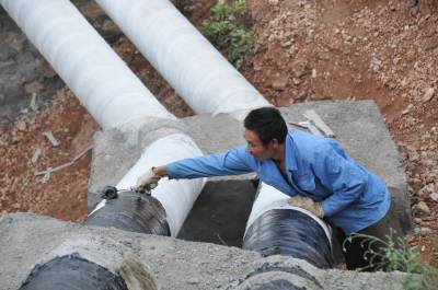 10月3日,湖北省郧县经济开发区供水管道铺设工程2标段的工人们正在对400毫米口径双线暴露在外的供水管道进行防腐施工,该工程长13公里长,自去年动工以来已铺设完成南水北调中线工程淹没线以下难度较大线路,预计年底完成,项目总投资4000万元,该工程是郧县经济开发区和太平岛的两地的供水管道。图为工人们正在为供水管道刷防腐涂料时的情景.周家山杨文华摄湖北省郧县城建监察大队电话13872840078邮编442500