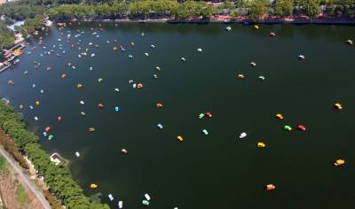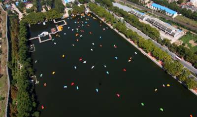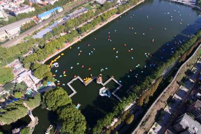 2010年10月4日,湖北省襄樊市,从空中向下看,五颜六色的游船象是盛开的花朵,将一池碧水打扮的格外美丽。国庆节期间天气晴好,许多市民纷纷来到襄阳公园护城河里划船,感受秋高气爽的美好时光。