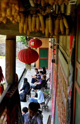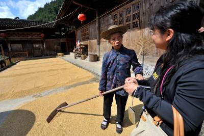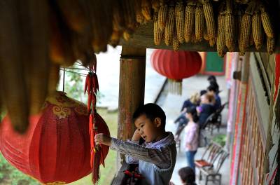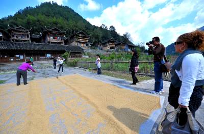 4日,游人们在宣恩县沙道沟镇彭家寨体验农家丰收的喜悦。黄金周期间,游人们前往恩施,除体验其秀美的山水,更多游客选择到农户家中,体验土(家)苗群体原生态的生活、劳作方式,与他们共同分享金秋丰收的喜悦。本报视界网宋文摄