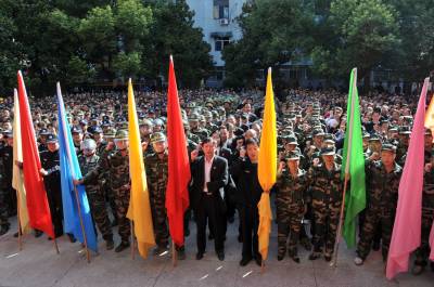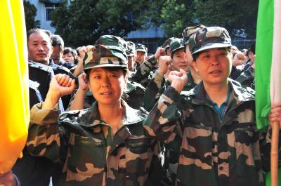 10月5日上午9时,湖北省郧县移民指挥部在汉江大桥南岸华阳集团郧阳汽车拨叉公司职工俱乐部门前广场举行郧县柳陂镇依法移民誓师大会,柳陂镇政府,各部门领导和县移民指挥部等领导先后表态发言,到会的公,检,法,司,工作队,综合执法局,民兵等1000多人举起右手庄严宣誓:”拥护中央决定,支持国家行动;遵守移民大纲,履行包保责任;坚决听从指挥,坚决完成任务”。截止日前郧县因南水北调中线工程己安全搬迁移民18000余人,还有12000余人将继续外迁,移民外迁工作进入攻坚阶役。图为综合执法局城管大队教导员陈平(左)正与30名队员一起举于宣誓时的情景。周家山杨文华摄湖北省郧县城管大队电话13872840078邮编442500