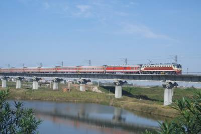 满足人民群众出行需求(附图)武汉铁路局在”十一”黄金周的旅客运输工作中,合理安排运能,积极扩充运力,极大地满足了人民群众探亲、旅游等出行的需求。图为10月6日,一列客车快速通过襄北清河大桥时的情景。