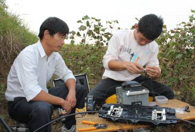 10月6日下午,孝感市传输局孝昌维修中心的工作人员经过几个小时的探摸检查发现,小河至王店间的16芯支干光缆由于遭到枪击,才导致两乡镇三千多用户手机通话信号受影响,连忙拨打了报警电话。18点30分许,笔者来到孝昌县小河镇石子村附近的村道边,见孝感市传输局孝昌维修中心的几名工作人员正在熔纤接线。孝昌维修中心主任李定杰告诉笔者,上午11时,他接到小河至王店间的16芯支干光缆受损抢修的指令后,立即带领维修人员从小河机房开始,搭起伸缩梯逐杆往王店方向检查。下午17时许,李定杰带领维修人员检查到56号杆2436米处时,发现光缆上有2个猎枪子弹孔,并且在路边的草丛中发现一枚猎枪弹壳。这条电缆是王店2个机站和小河两个机站的连接线,承担着两地3000多用户的手机信号传输。于是,李定杰连忙拨打小河派出所的电话报了案。小河镇石子村5组56岁的村民张玉兰说,昨天(5日)午饭过后,他正在村口的田埂上割柴草,突然听到”砰”的一声枪响。抬头一看,发现前方的村道边停着一辆黑色的小车,有两名男子正在往电杆方向的棉花田拣死鸟。其中一人手持猎枪。宋俊初摄