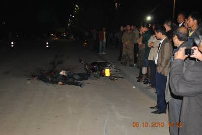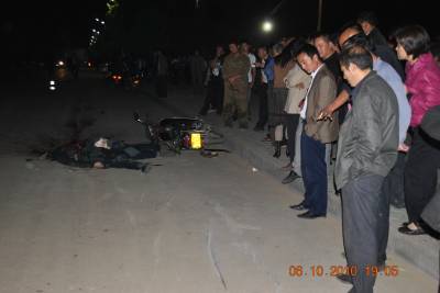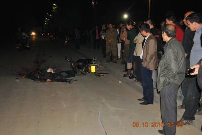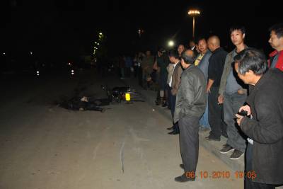 图文:郧西惨祸致两人死亡6日晚18时许,在郧西县城天河广场前,一辆拉沙的无牌”后八轮”货车从一辆骑乘摩托车身边碾过,并前行约数十米才刹住车,致使乘摩托车两男子当场惨死,死者的脑袋、心肺、肠子拉出,约3米血迹,现场惨不忍睹。事故发生后,该县交警部门迅速赶到现场开展勘察。目前,事故原因正在进一步调查之中。(本报视界网徐雁初摄)