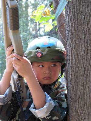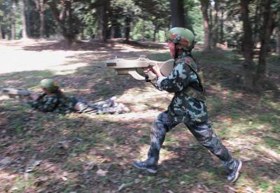 2010年10月6日,武汉市儿童在东湖树林里,用真人CS装备,在体验激光对抗射击活动中,感受团结合作带来的快乐。