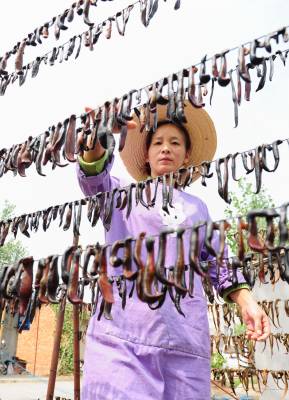 吸血的水蛭”吸金”7日,湖北省潜江市积玉口镇”水蛭大王”吕萍在翻晒水蛭。吕萍有7年的水蛭收购销售经验,经过摸索和查找资料掌握了水蛭制干的方法技巧,并与山东、山西、等地的制药厂建立了联系,常年为制药厂供应水蛭干,收入可观。并带动了周边水蛭养殖和捕捞的发展。目前,吕萍已销售40万元的水蛭,全年预计可以销售100万元水蛭。吴燕军
